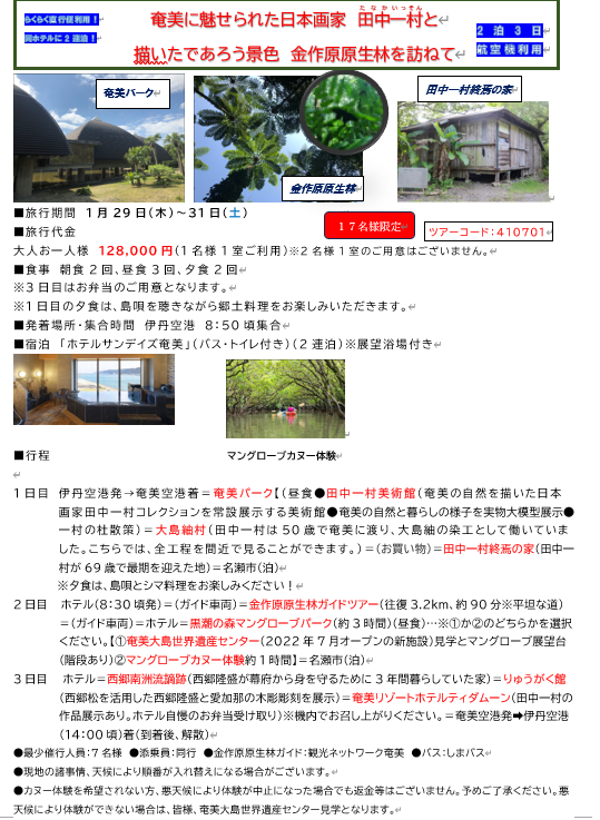 この商品は募集型企画旅行です。旅行条件については こちら の「(国内)募集型企画旅行条件書」を確認の上、印刷又はファイル保存してください。