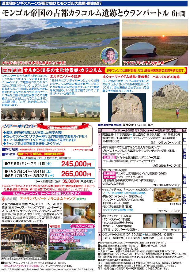 ・カラコルム博物館 ※但し、7月27日発は3泊目:ブルドスターリゾート(部屋にシャワー・トイレ付のゲルタイプ)になる予定です。 宿泊 ◆アサランドリゾート カラコルムキャンプ | 朝 昼 夕 |