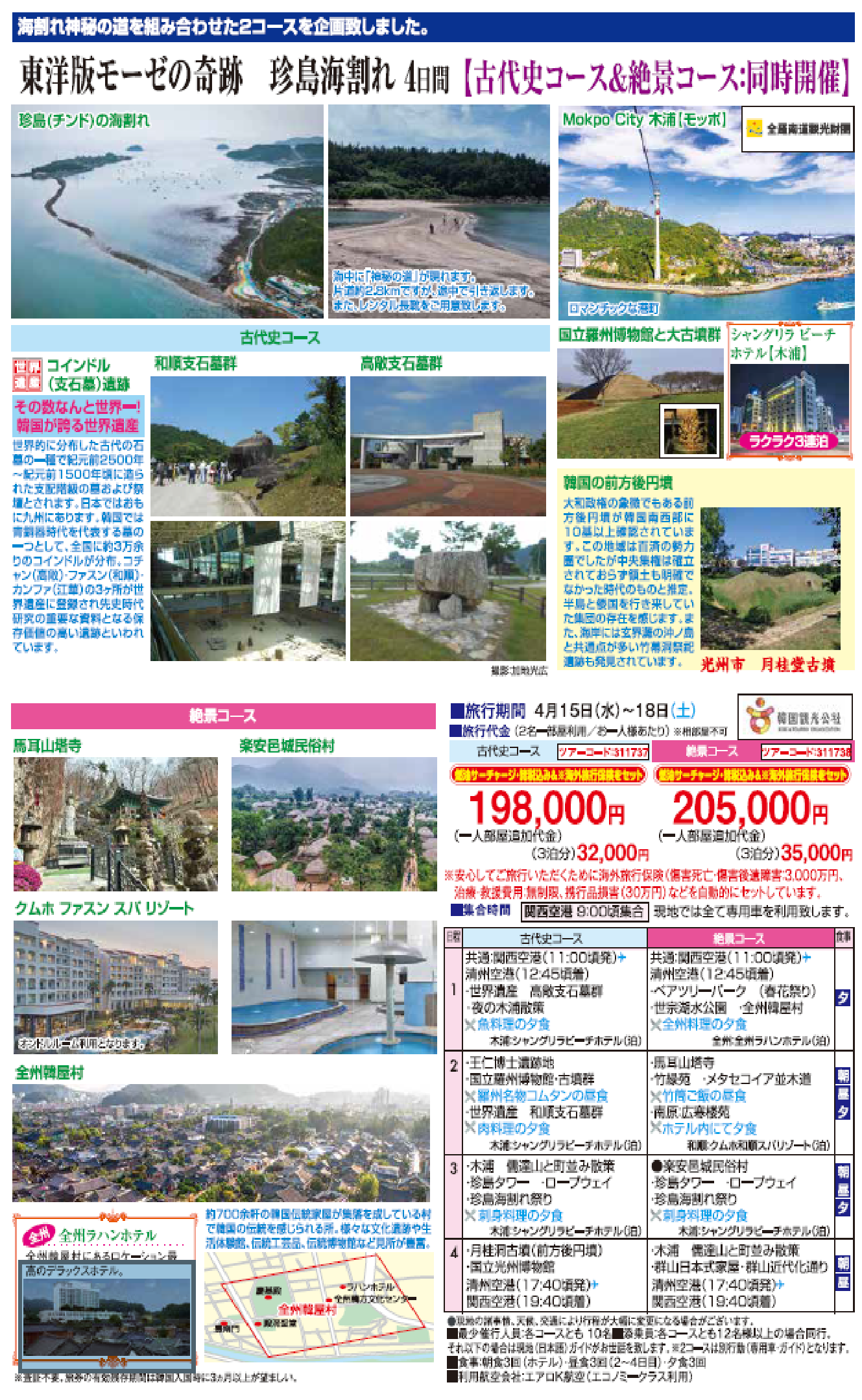 【旅行代金に含まれるもの】 @旅行日程に明示した運送機関の運賃・料金(注釈のない限り航空便は普通席)などの交通費、宿泊費、食事代、旅行取扱料金、及び消費税等諸税。 A添乗員が同行するコースの添乗員経費等。 B各コースごとに表示した「旅行代金に含まれるもの」として明示したその他の費用。 上記諸費用はお客様のご都合により、一部利用されなくても払い戻しはいたしません。 ■旅行代金に含まれないもの @ 行程に含まれない交通費、飲食費。 A 行程に含まれない交通費、飲食代等の諸費用及びクリ−ニング代、電報電話料等個人的性質の諸費用及びそれに伴う税・サ−ビス料。 B自由行動中の費用。 ご希望者のみ参加されるオプショナルプラン(別途料金)の代金。